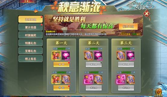 活动期间,每日连续充值指定金额可获得稀缺时装碎片、粉钻、抽奖券和珍惜碎片,特别需要注意错过可以补签。