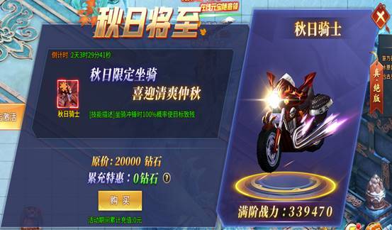 活动期间,累计充值达到指定金额便可获得限定坐骑-秋日骑士;最高可将坐骑技能升至满级。