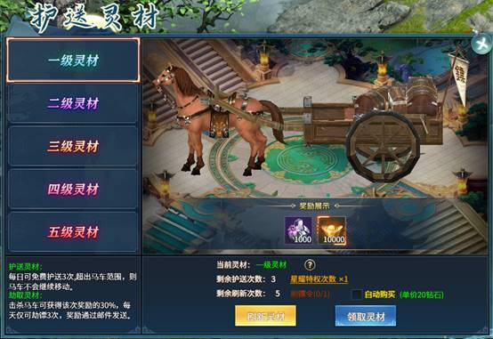 玩家每天免费护送3次灵材马车,马车可以获得大量神秘商店道具和元宝。