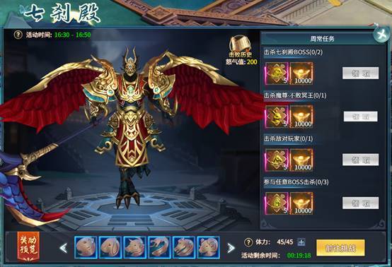 击杀七刹殿内BOSS积攒怒气值,怒气值到达200点地图中心会召唤魔尊,击败魔尊会掉落生肖装备和其他成长材料。